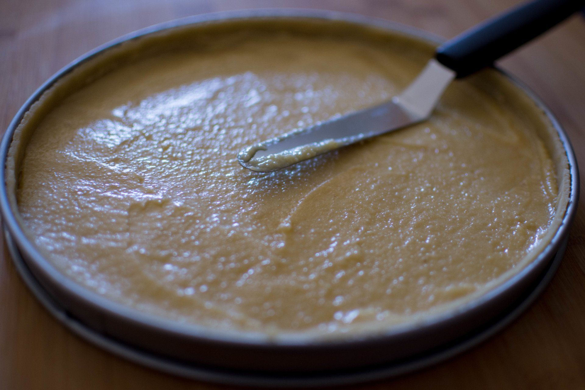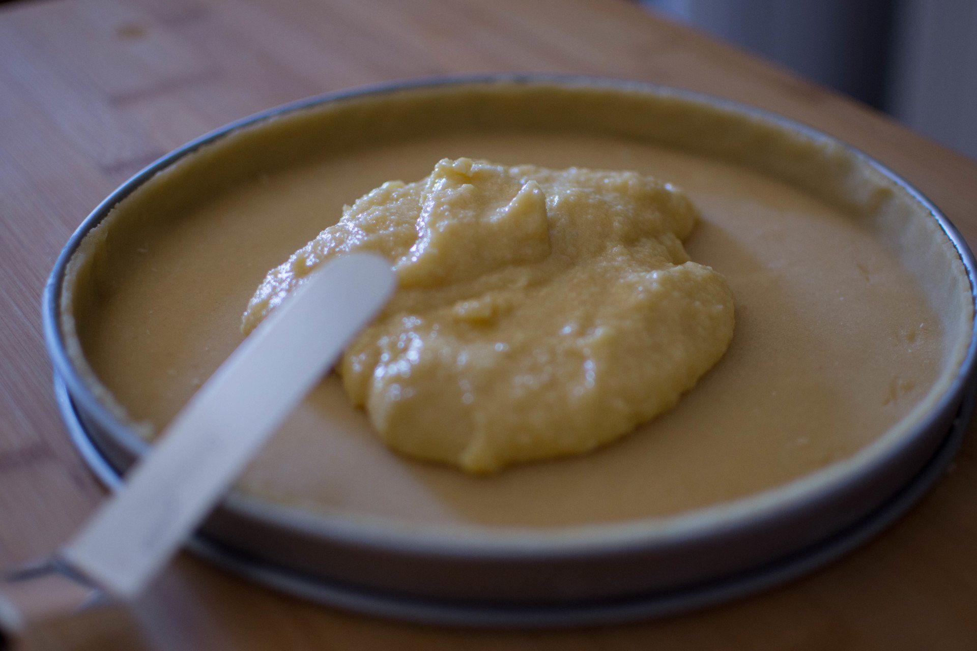 Au bout de 15 minutes, sortir la pâte et étaler la crème d'amandes à l'aide d'une petite spatule.