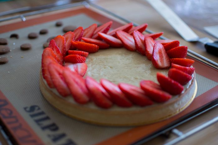 Préparer les fraises : les couper en deux. Si il y a des grosses différences de taille, les trier , garder les plus grosses pour la première rosace et les plus petites pour l'intérieur de la tarte.